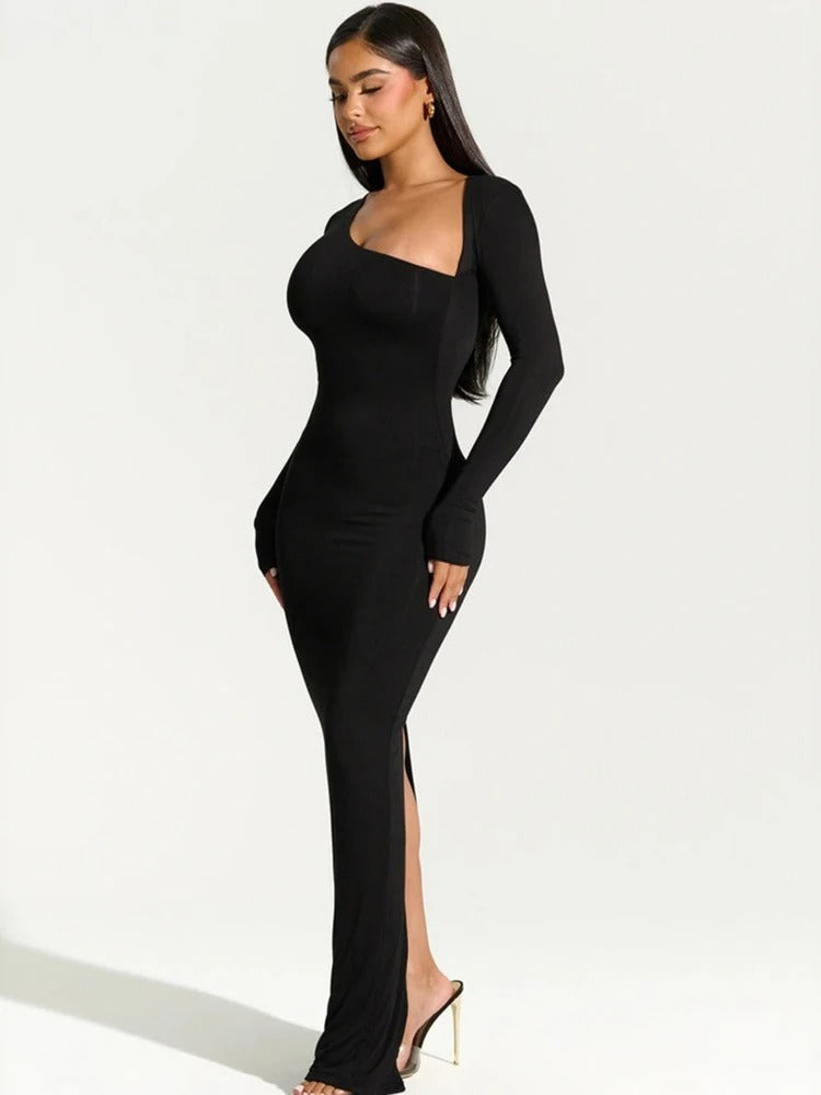 Elevate your evening presence with the Zarine Sculpted Timeless Maxi, a masterpiece of classic sophistication and modern allure. This elegant black maxi dress features an asymmetrical long sleeve design and a daring side split that balances grace with a hint of sensuality. Crafted to sculpt and flatter your silhouette, its tailored fit and refined fabric exude timeless charm perfect for fall and winter nights, upscale parties, and nightclubs where sophistication meets seduction.