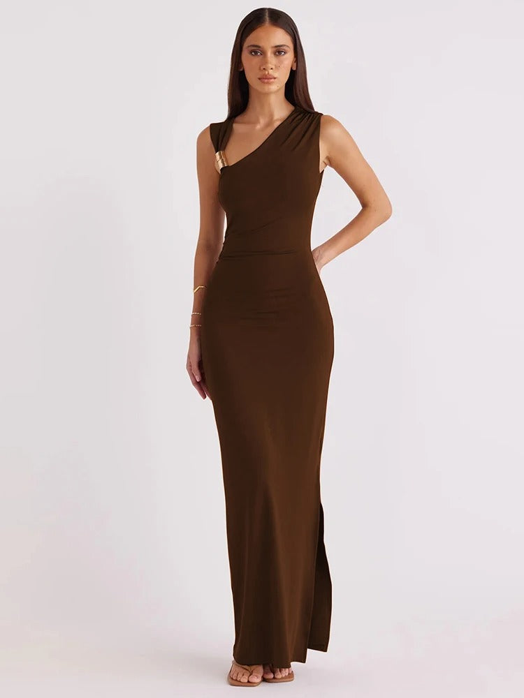 Turn heads and ignite the night with the Brun Sucre 9: Slanted Desire. This stunning maxi dress features a bold slanted collar and a daring backless design that exudes confidence and allure. Crafted with a sleek, bodycon fit and a seductive side split, it’s perfect for club nights, parties, or any event where you want to shine. The metal ring detail adds an edgy touch to this sleeveless gown, combining elegance and modern fashion in one irresistible look.