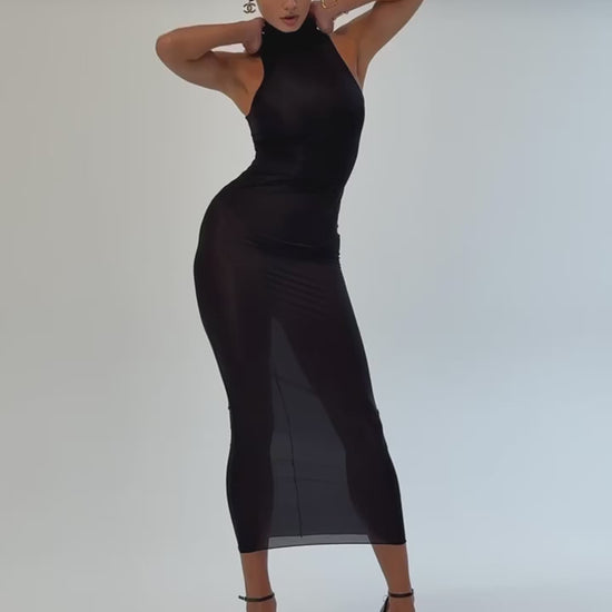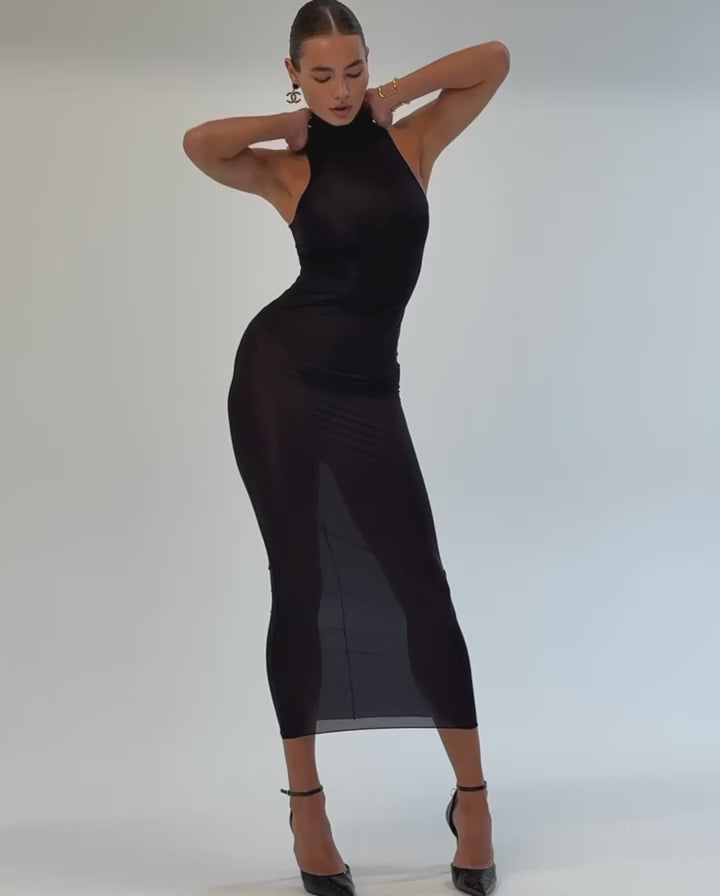 Turn up the heat in the Illusion Maxi Dress — a fearless fusion of sheer seduction and summer glam. This stunner hugs every curve with its sleeveless bodycon fit, while the see-through turtleneck mesh teases just the right amount of skin. Bold, breathable, and unapologetically sexy, it’s the ultimate statement piece for beachside nights, rooftop parties, or anywhere you plan to break hearts and steal attention.